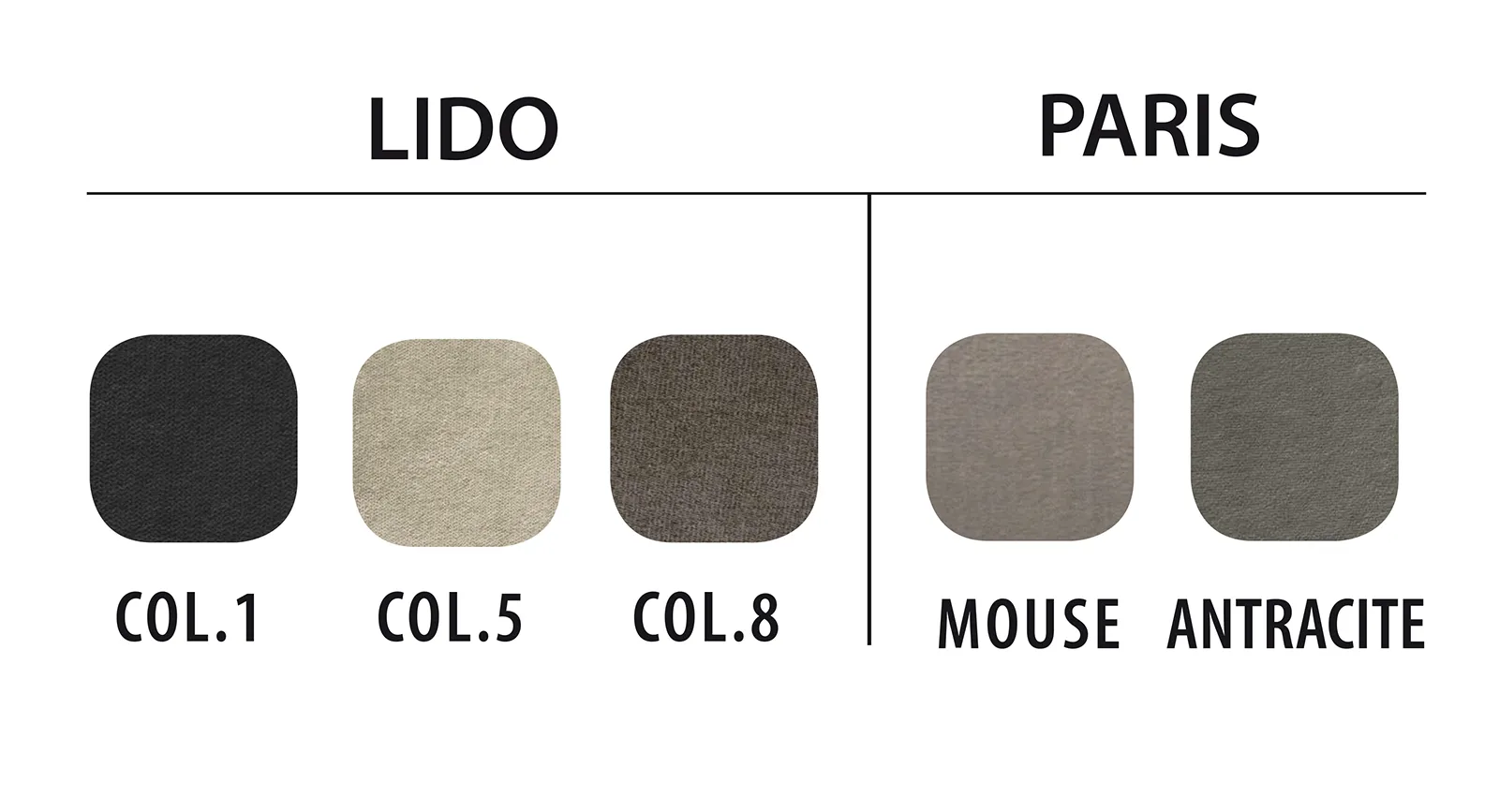 Base tapizada con tejido 3D antideslizante, estructura reforzada de madera maciza y estructura metálica de refuerzo. Disponible en dos series de acabados: Lido y París, y con múltiples opciones de patas en madera o metálicas.